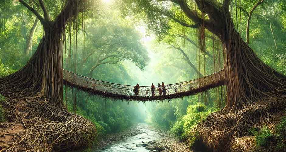 U Indiji se stoljećima koriste tradicionalni oblici visećih mostova, posebno u himalajskim regijama. U Meghalaji, sjeveroistočna Indija, domorodačka plemena su izgradila mostove koristeći živo korijenje drveća, posebno indijskog kaučukovca (Ficus elastica). Ovi “mostovi sa živim korijenom” jedinstveni su oblik visećeg mosta i može potrajati od 15 do 30 godina da narastu, ali mogu trajati stoljećima nakon što se uspostave.