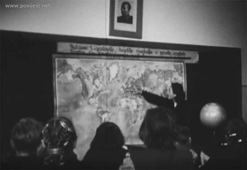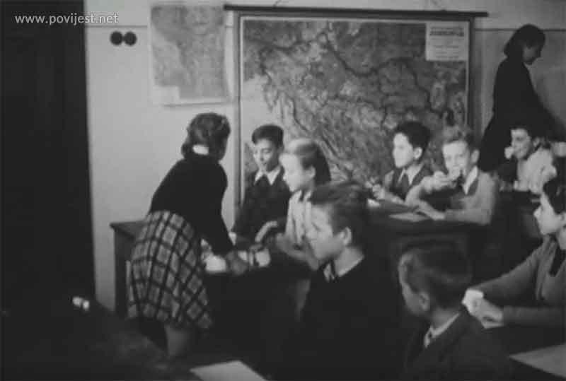 Zavirite u autentičnu učionicu jugoslavenske škole iz 1950-ih godina! U kratkom edukativnom filmu prikazane su originalne arhivske snimke iz školskog okruženja: učiteljica s kartom Jugoslavije objašnjava međunarodne odnose, školska kuhinja priprema obrok, a učenici sami poslužuju i jedu za svojim klupama.